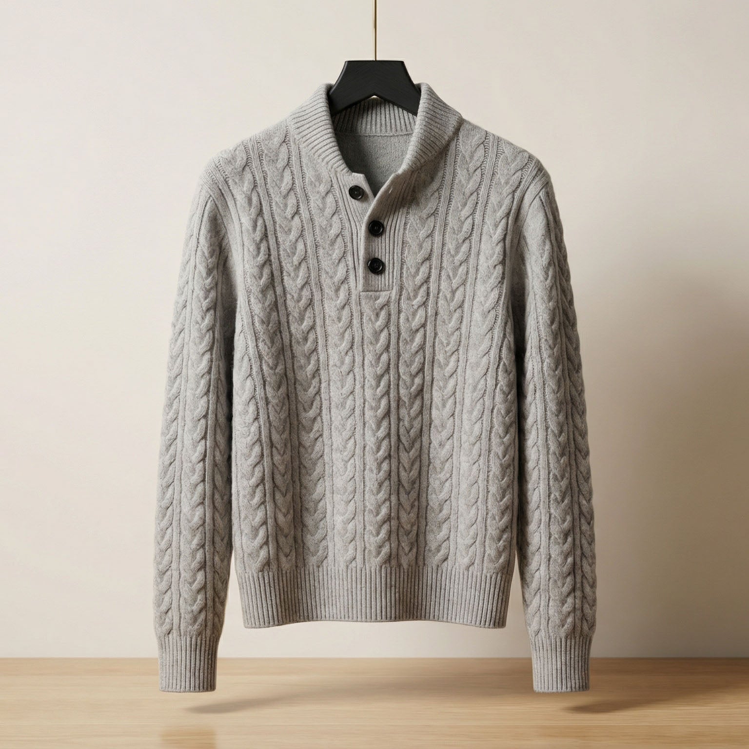 Crafted from a luxury cable-knit yarn, this sweater feels warm, substantial, and softly textured with a reassuring weight that settles comfortably on the body. Designed to offer familiar comfort with quiet structure, its classic knit pattern, structured collar, and restrained button placket create a composed everyday layer that feels grounded, dependable, and effortlessly put-together.