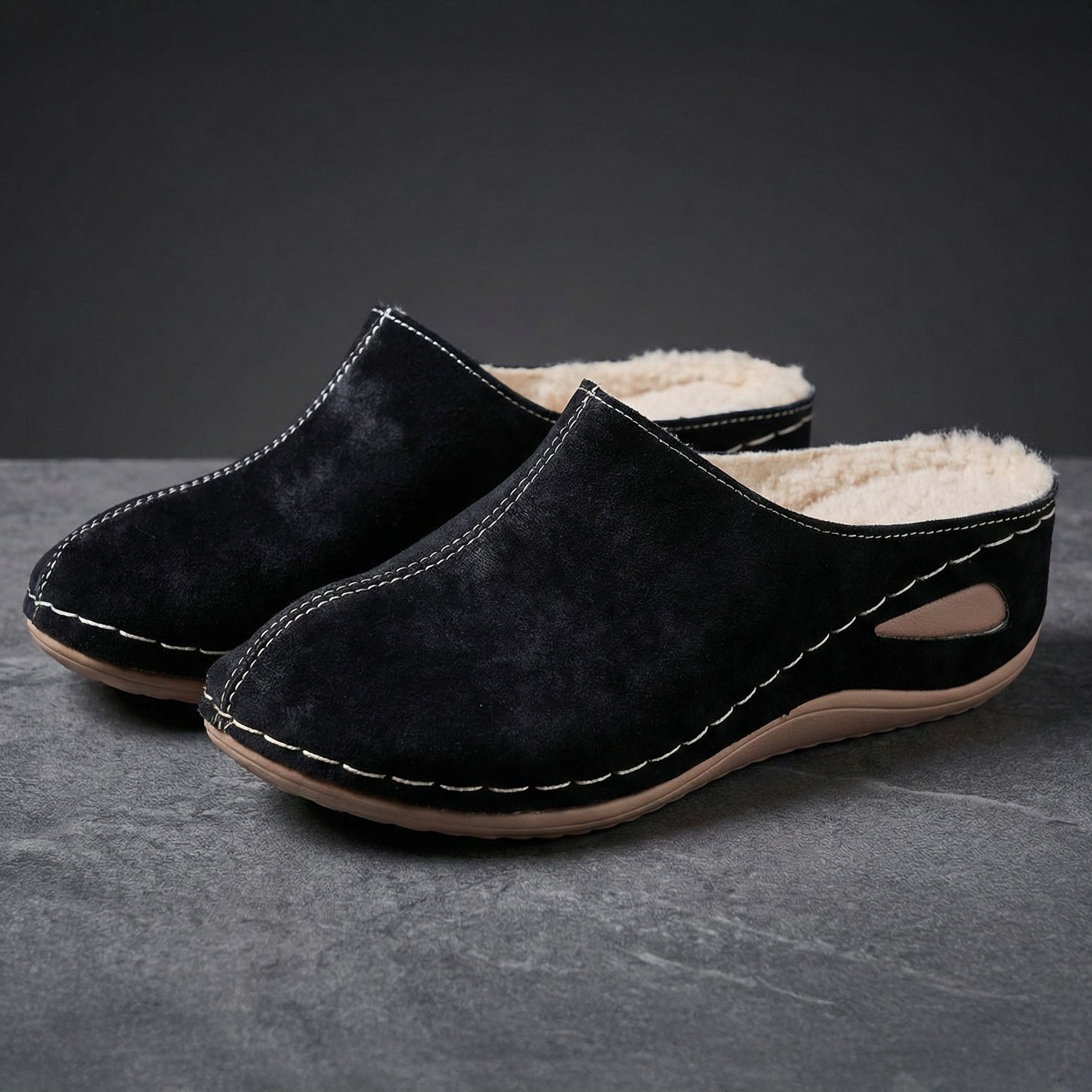 Crafted from a suede-effect upper with a plush, soft-touch lining, these slippers feel smooth on the outside and gently cushioned underfoot for immediate ease. Designed to provide quiet support at home, the closed, structured silhouette and calm, understated finish deliver comfort that feels intentional, composed, and self-respecting in everyday downtime.